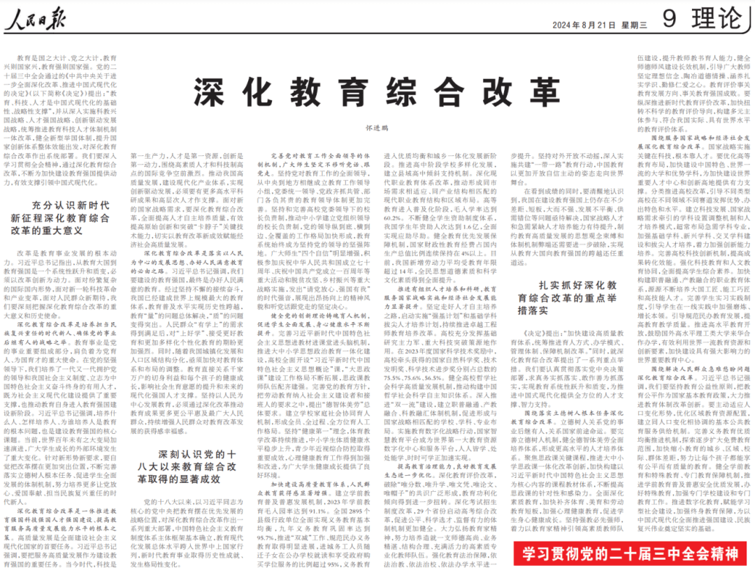 《决定》提出:“加快建设高质量教育体系,统筹推进育人方式、办学模式、管理体制、保障机制改革。”同时,就深化教育综合改革提出了一系列重点举措。我们要认真贯彻落实党中央决策部署,求真务实抓落实、敢作善为抓落实,实现教育系统性跃升和质变,为推进中国式现代化提供全方位的人才支撑、智力支持。