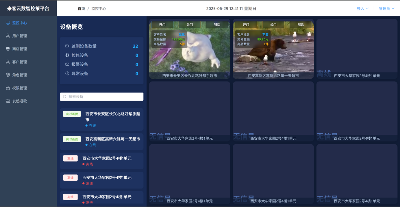 平台以人工智能技术为驱动,全面赋能零售运营场景。通过AI数字人客服系统,实现拟人化交互与全天候智能响应,显著提升服务效率并降低人力成本。同时,依托计算机视觉与智能数据分析技术,平台可精准识别商品、实时同步交易信息、动态生成运营洞察,为商户提供数据驱动的决策支持,构建智能化、自动化、可追溯的零售运营新范式。平台实现了客户扫码开门、客服远程开门、门禁状态监控、摄像头监控、门店网络监控、音视频通话、数字人交互、店铺信息同步、订单信息同步、退款发起、系统管理等全业务流程的数字化管控,并通过与ERP系统的深度协同,打通“出入管理-销售交易-库存管理-财务管理”的全链路,构建“无人值守+智能服务+数据驱动+统筹管控”的新型零售运营模式。